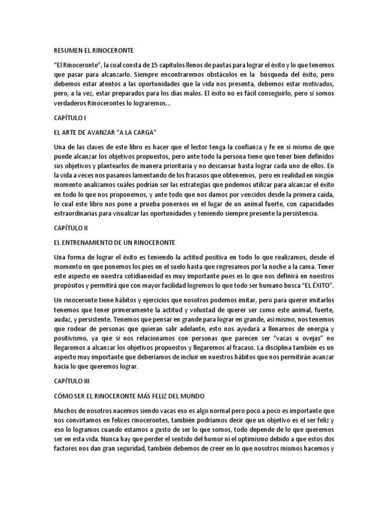Conocí sus arrebatos de furor, su ternura momentánea, y en las altas horas de la noche, su lujuria insistente y ceremoniosa. Resumen de los primeros 7 capitulos del libro el rinoceronte. Resumen del libro el rinoceronte este resumen es del libro el rinoceronte cuenta con 15 capitulos que basicamente se trata de una guia practica para alcanzar el éxito.el personaje principal es el rinoceronte y habla básicamente de que somos nosotros los rinocerontes. Es por esto que a continuación se presenta un análisis de la obra el rinoceronte, la cual consta de 15 capítulos llenos de pautas para lograr el éxito y lo que tenemos que pasar para alcanzarlo. Siempre encontraremos obstáculos en la búsqueda del éxito, pero debemos estar atentos a las oportunidades que la vida nos presenta.